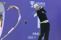 1번홀 티박스에서 드라이브샷을 하고 있는 박지영 선수